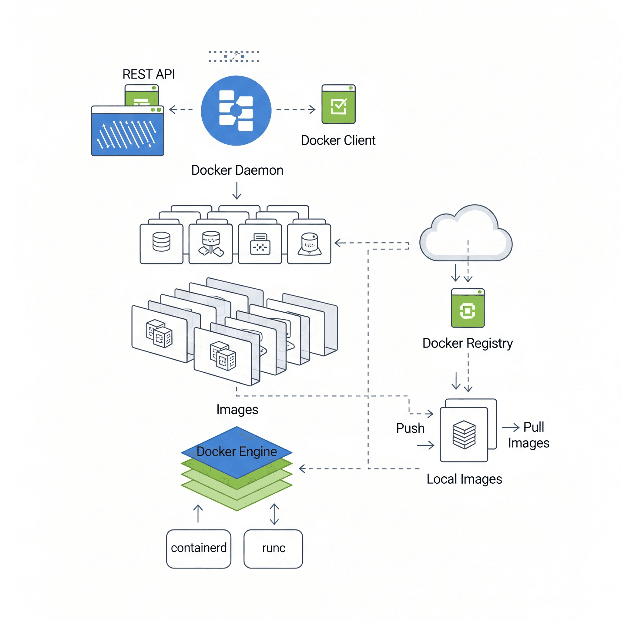 - Docker Engine: A runtime that builds, runs, and manages containers.